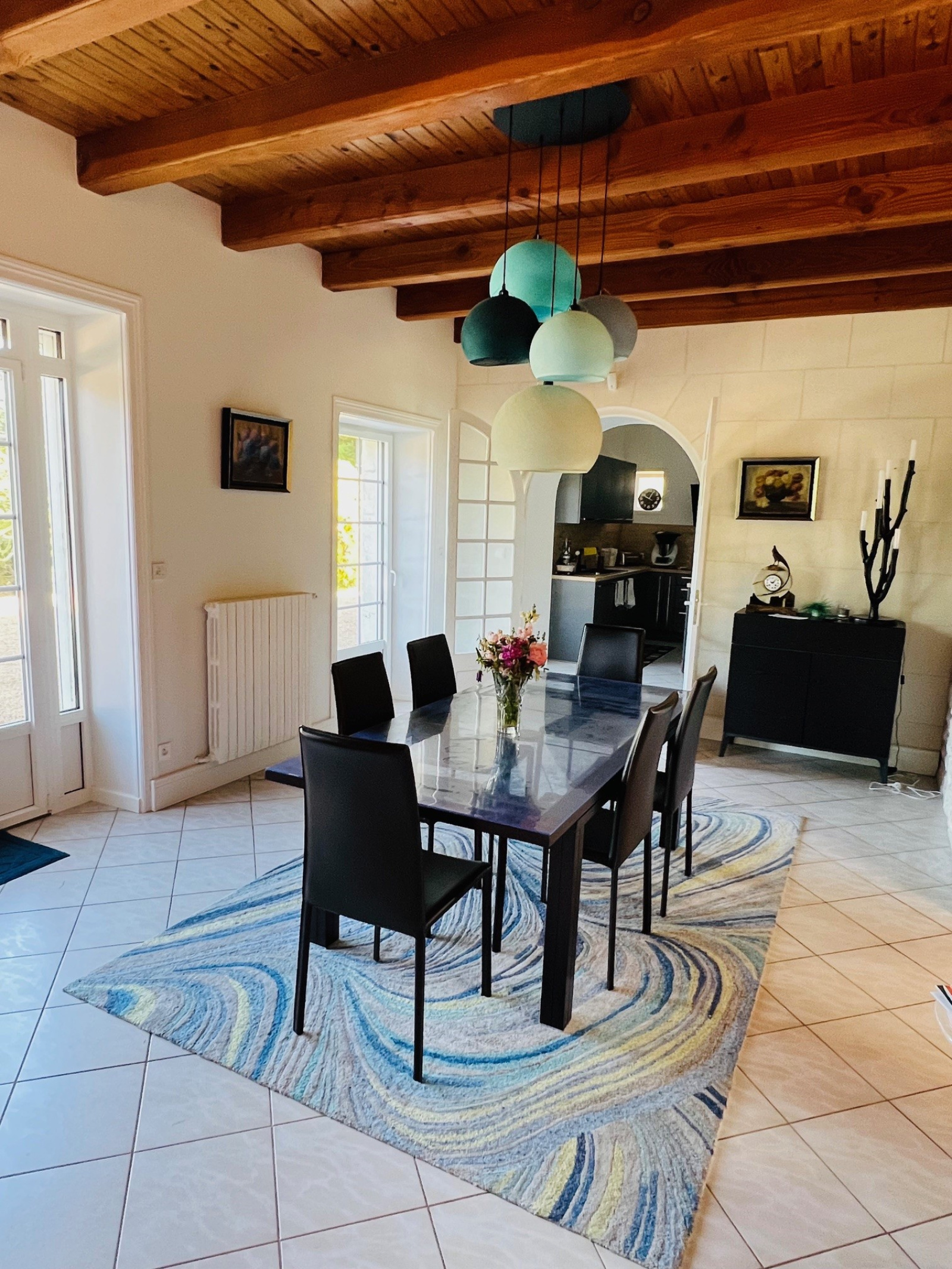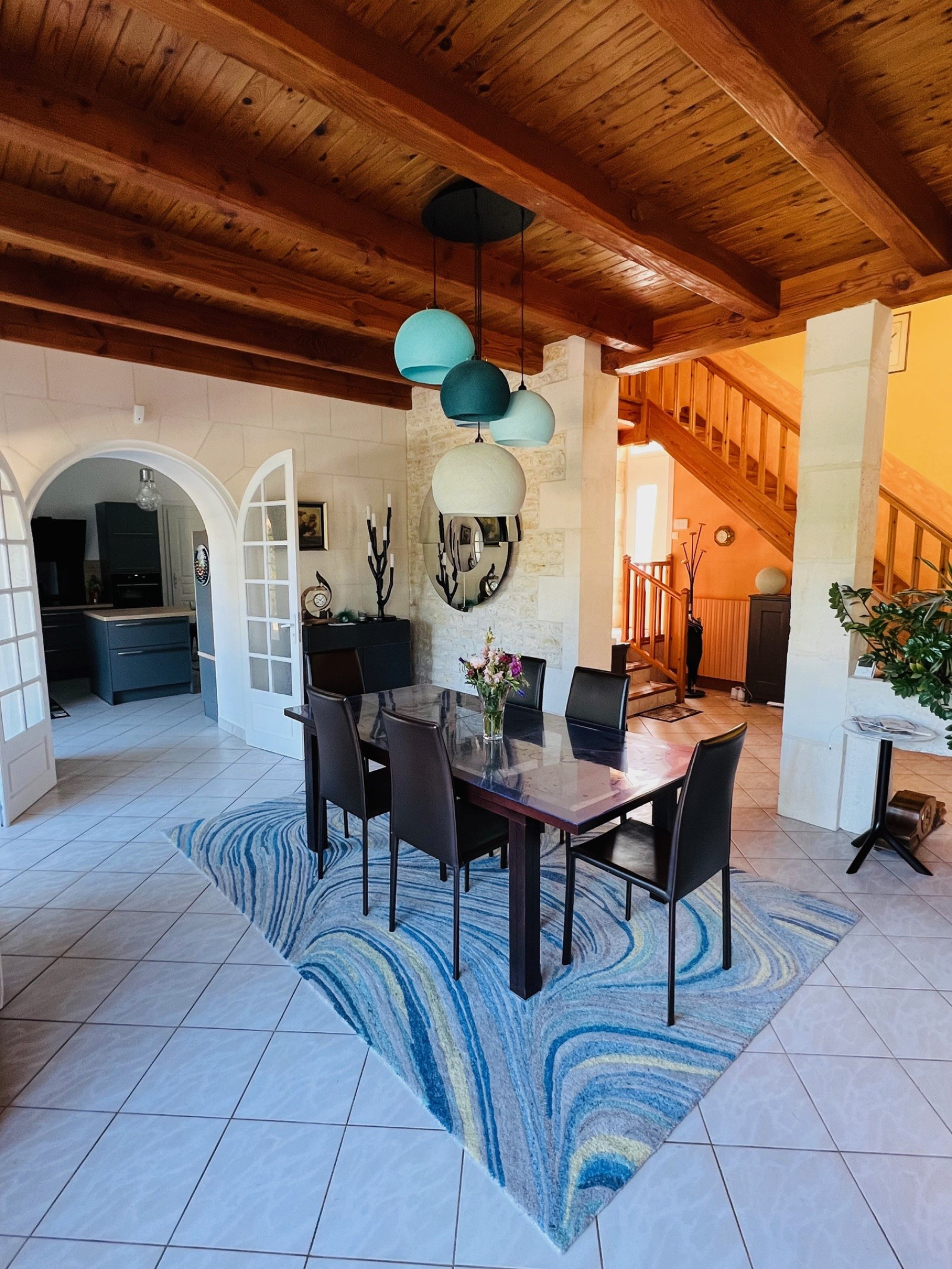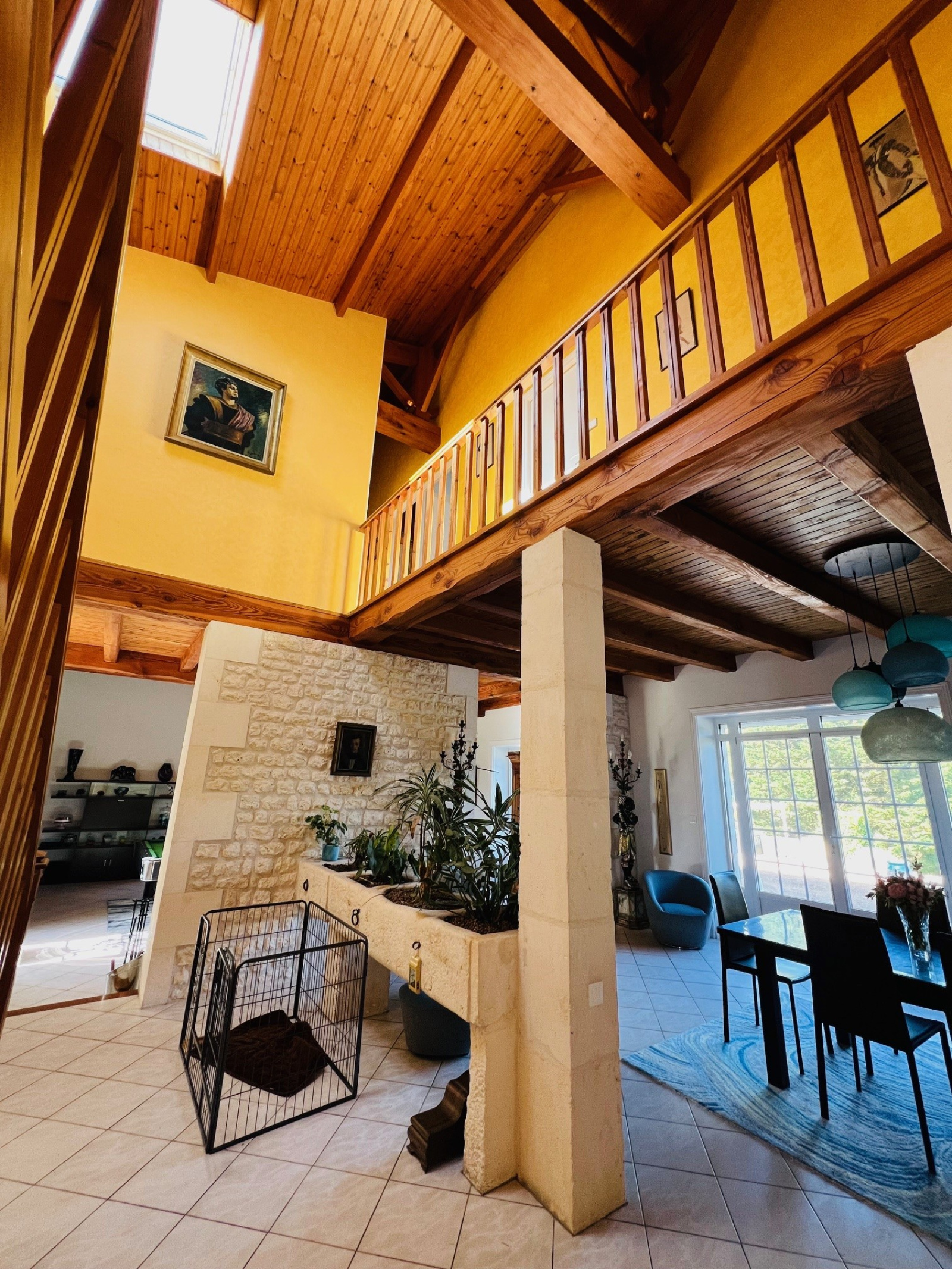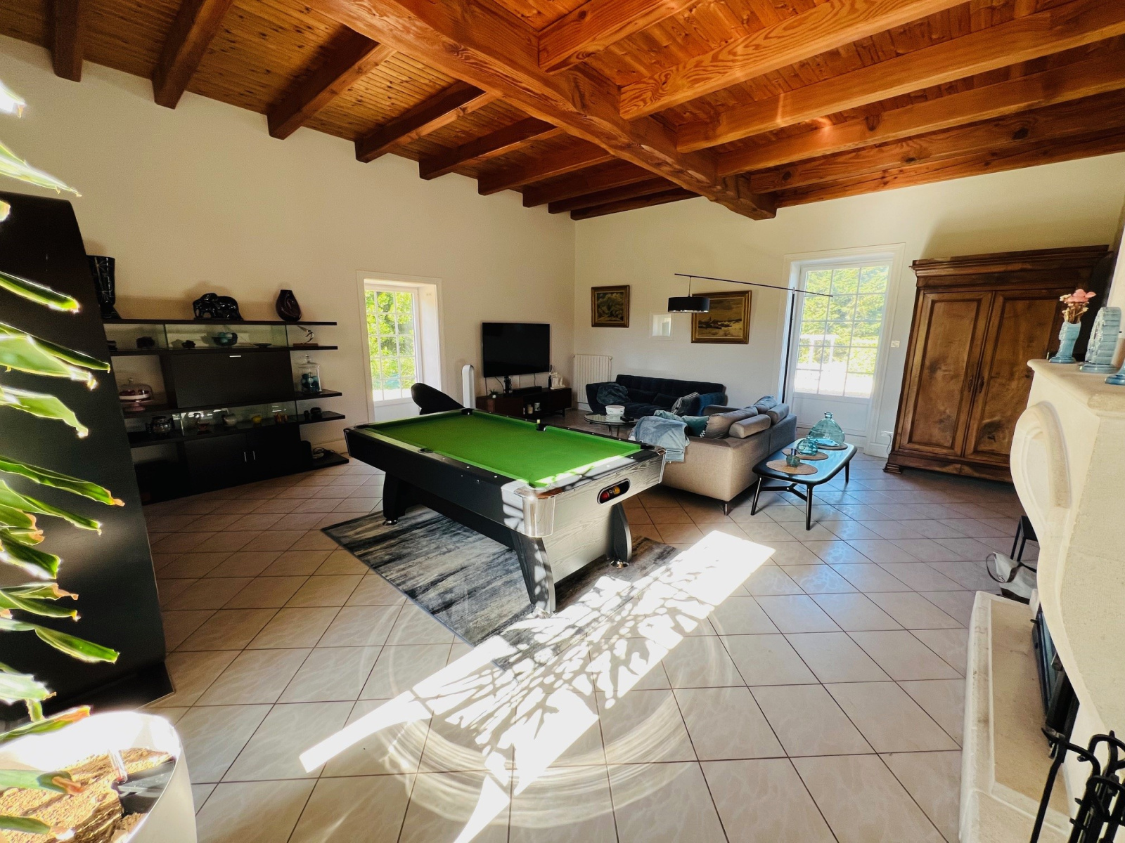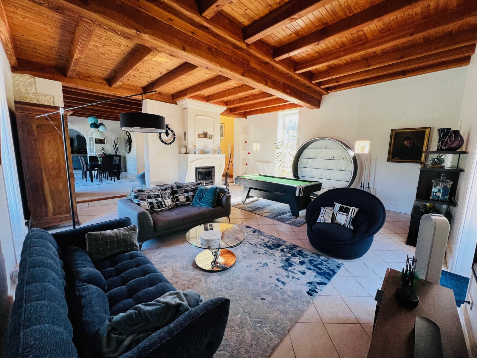 L'immense pièce de vie dessert de véritables espaces conviviales : une salle à manger, un salon et un espace billard.