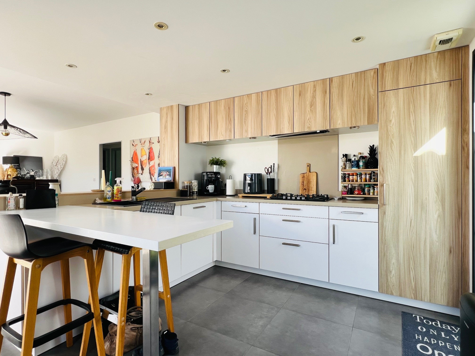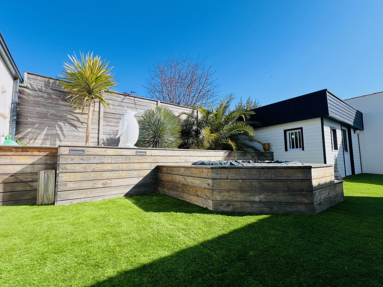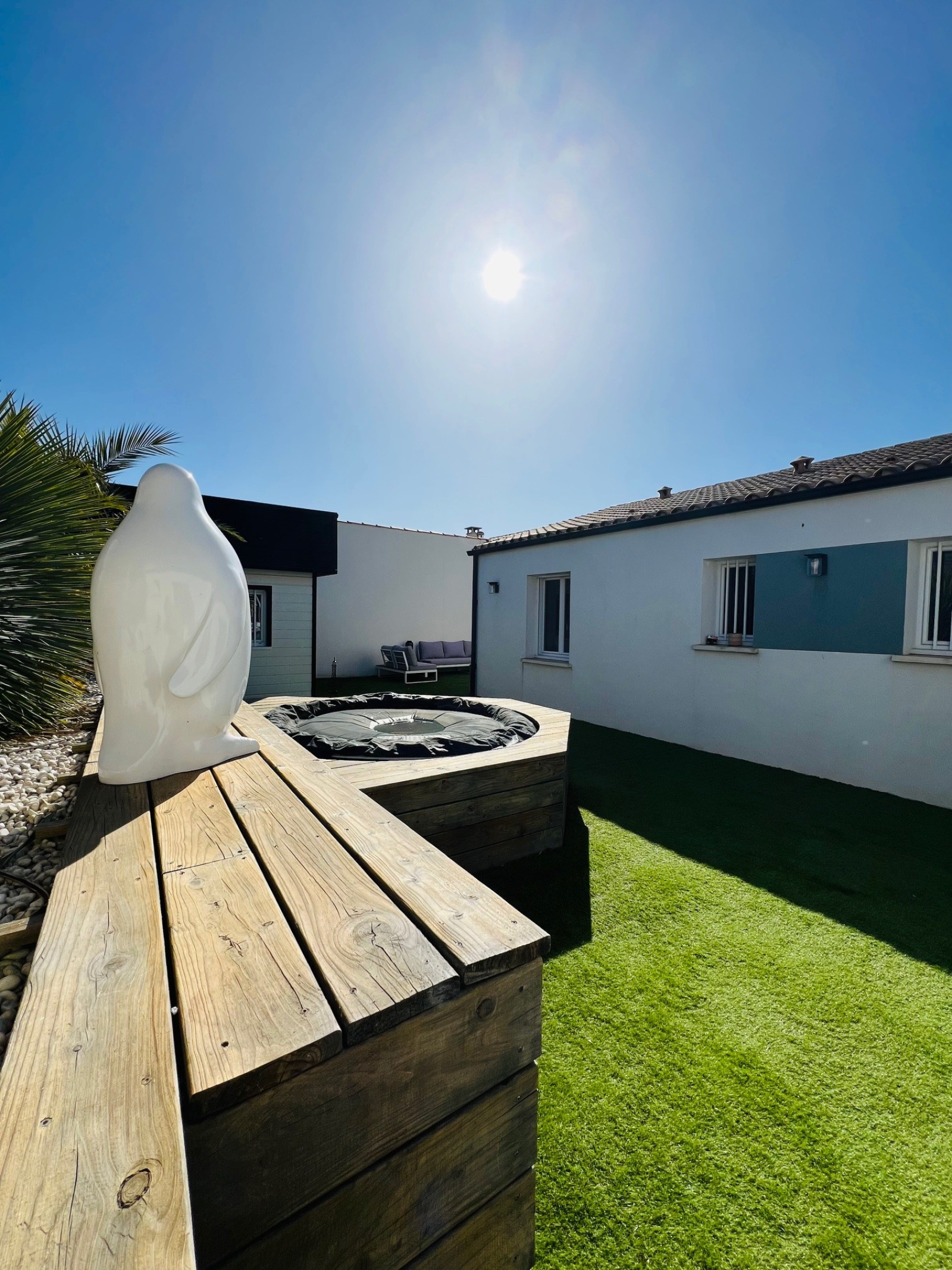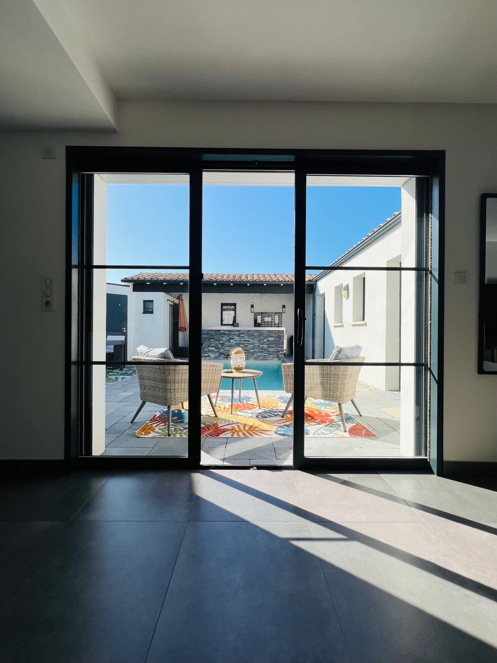 Dès l’entrée, un patio d'accueil avec piscine et cuisine d'été vous invite à découvrir un espace lumineux orienté plein sud.