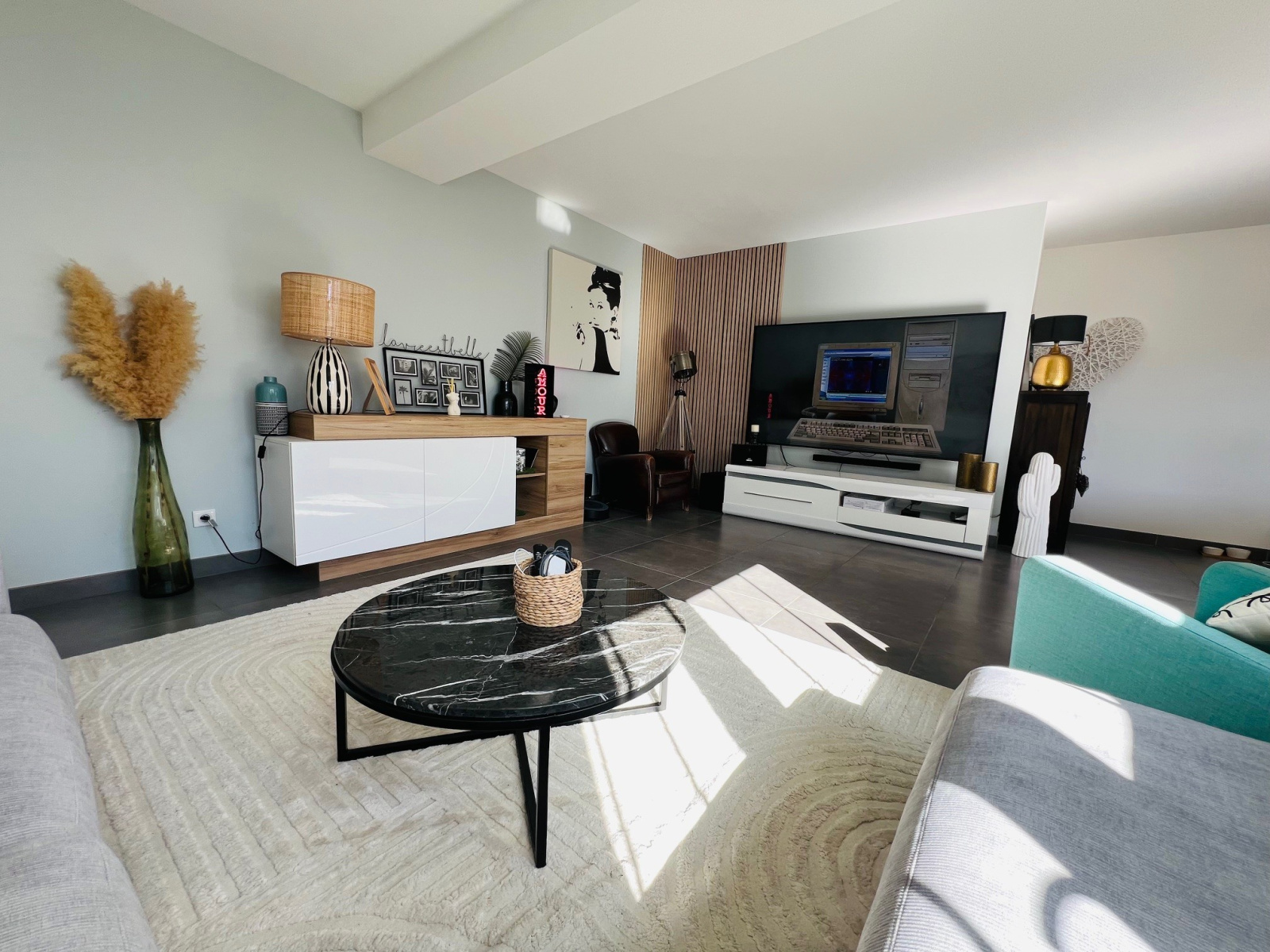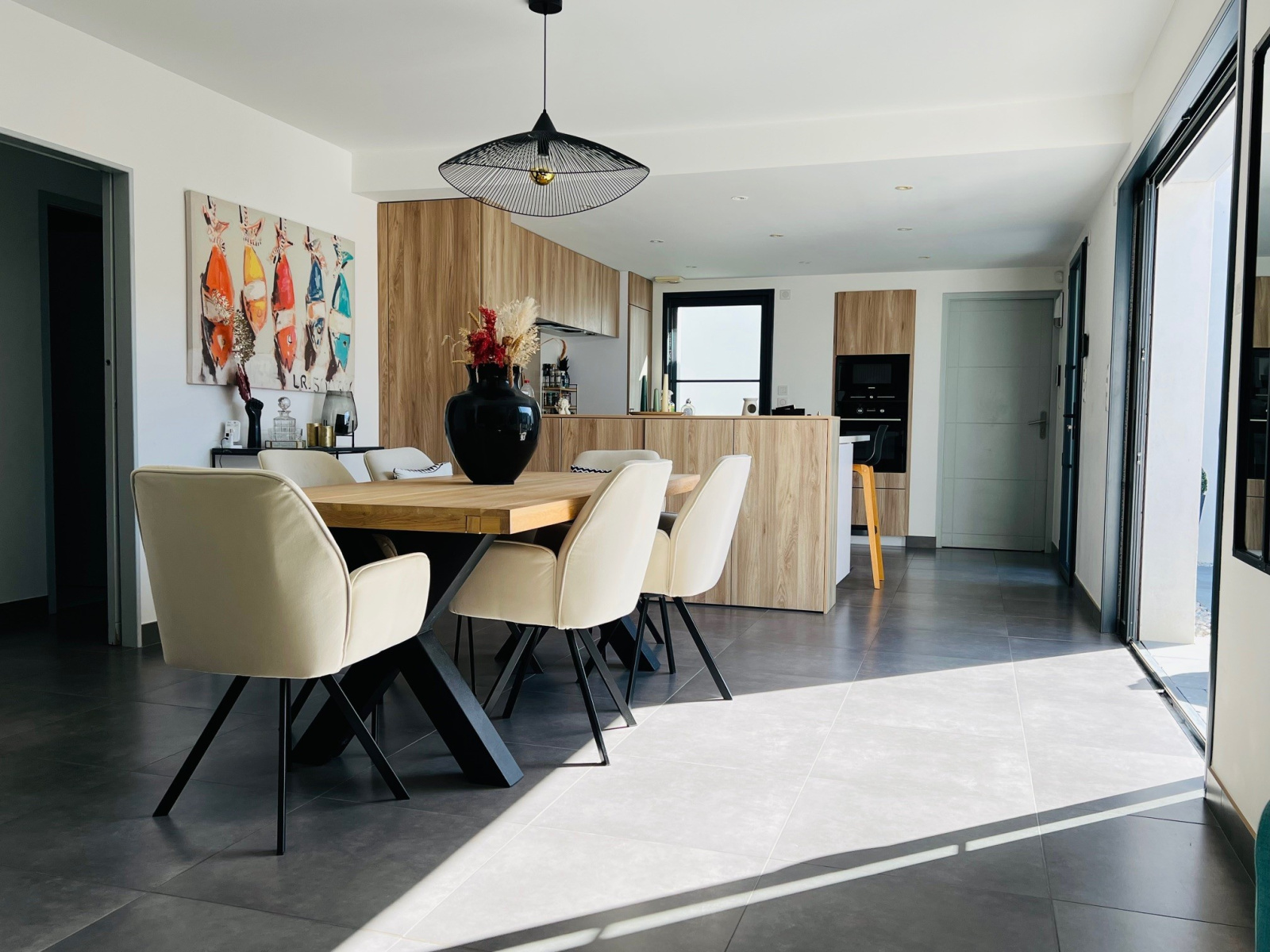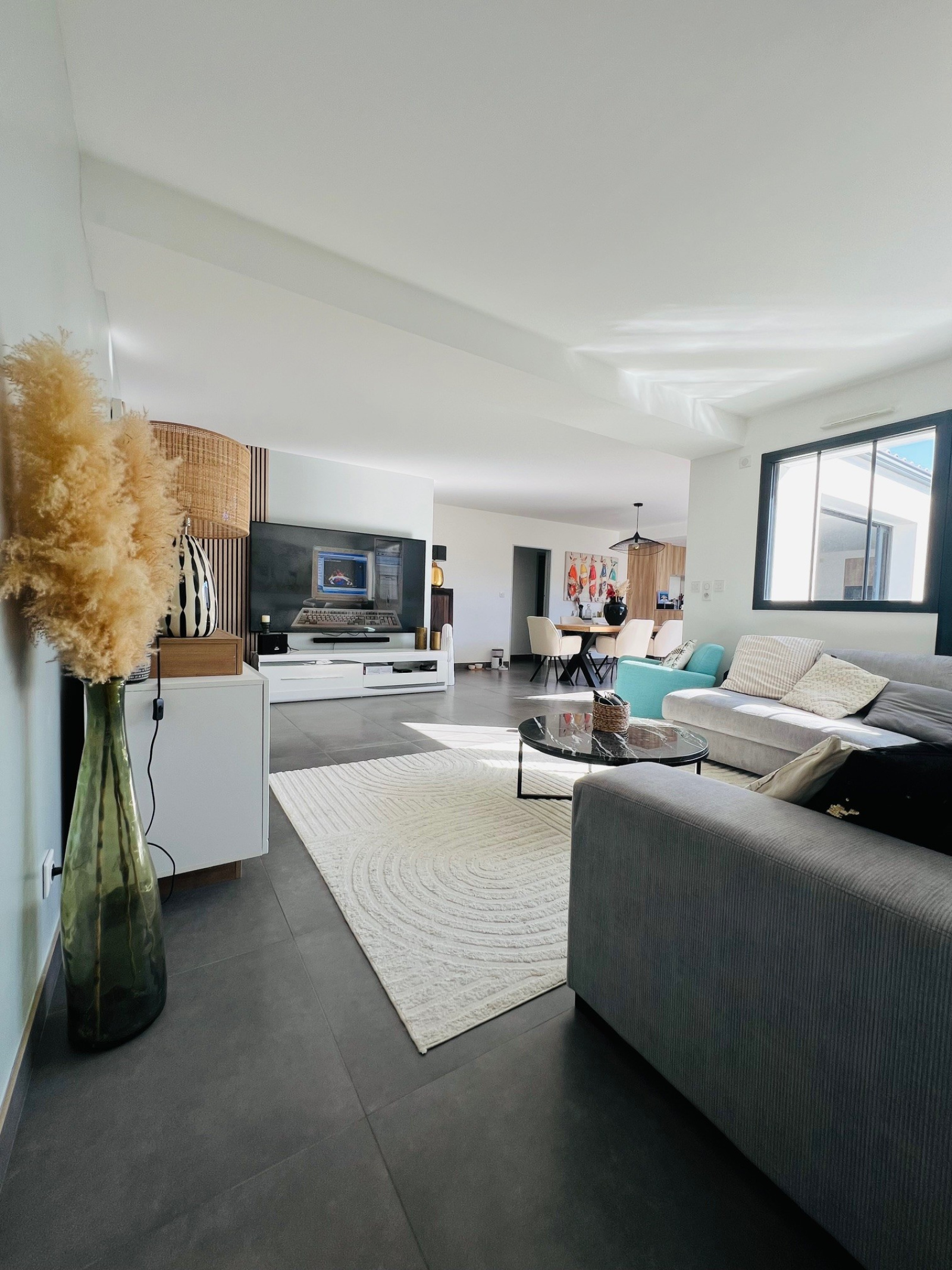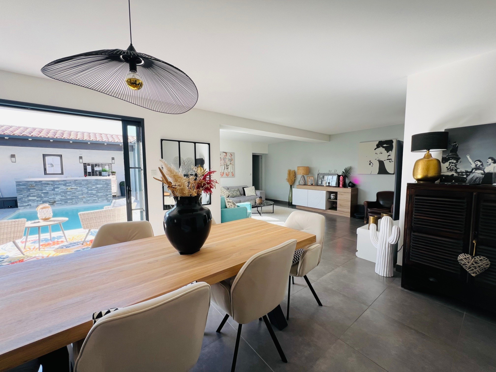 La pièce de vie d’environ 53 m², généreuse et ouverte sur le patio d'entrée, comprend un salon, une salle à manger et une cuisine équipée et aménagée.