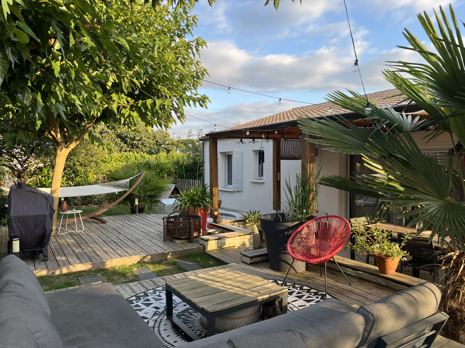 Côté jardin : un espace entièrement arboré et soigné, une immense terrasse avec un coin SPA, un espace détente avec son espace repas sous pergolas étanche. Arrosage automatique et abris de jardin.