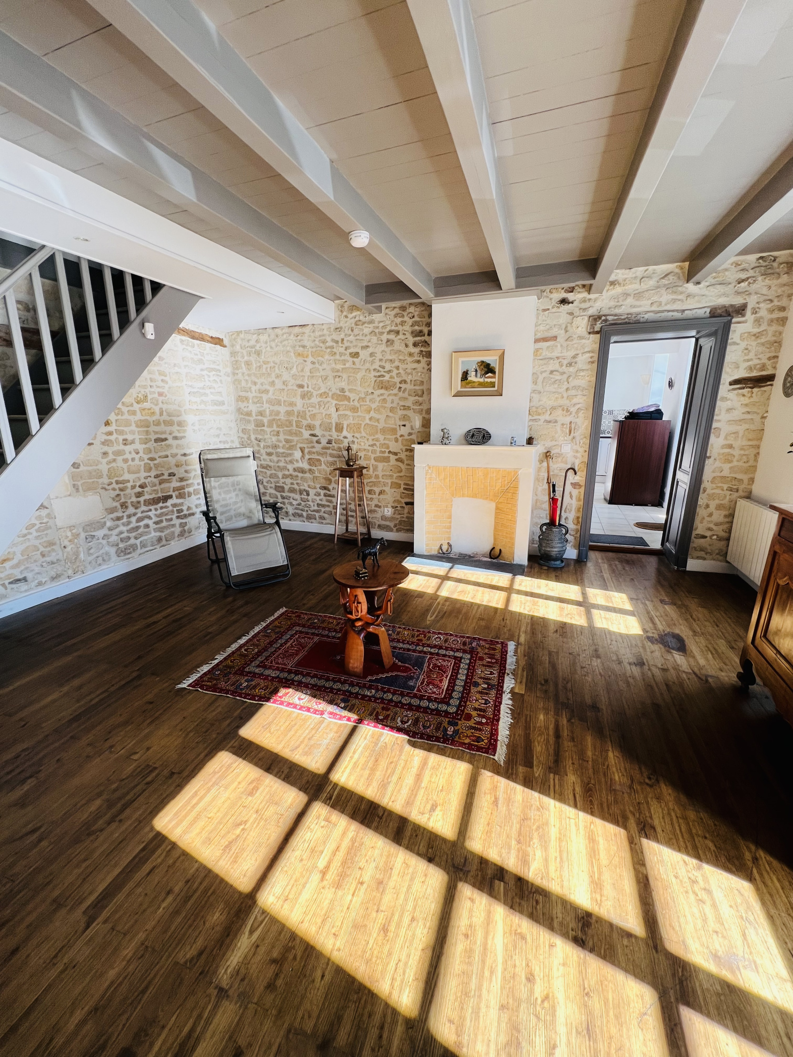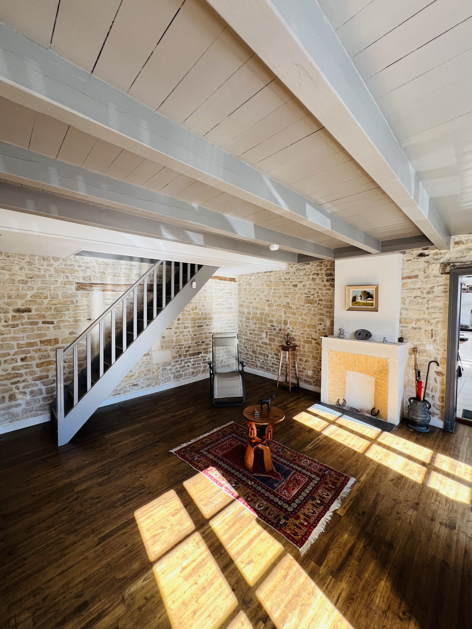 - Un salon-séjour mélangeant les pierres apparentes et le parquet ancien de presque 30 m² avec sa cheminée, très lumineux.